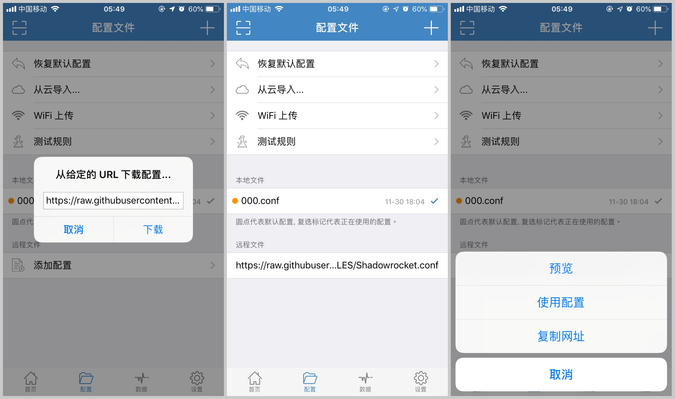 随后点击 远程文件 中新增的配置文件地址,在弹出的菜单中选择第二个「使用配置」,此时 APP 会自动开始下载配置并应用配置。