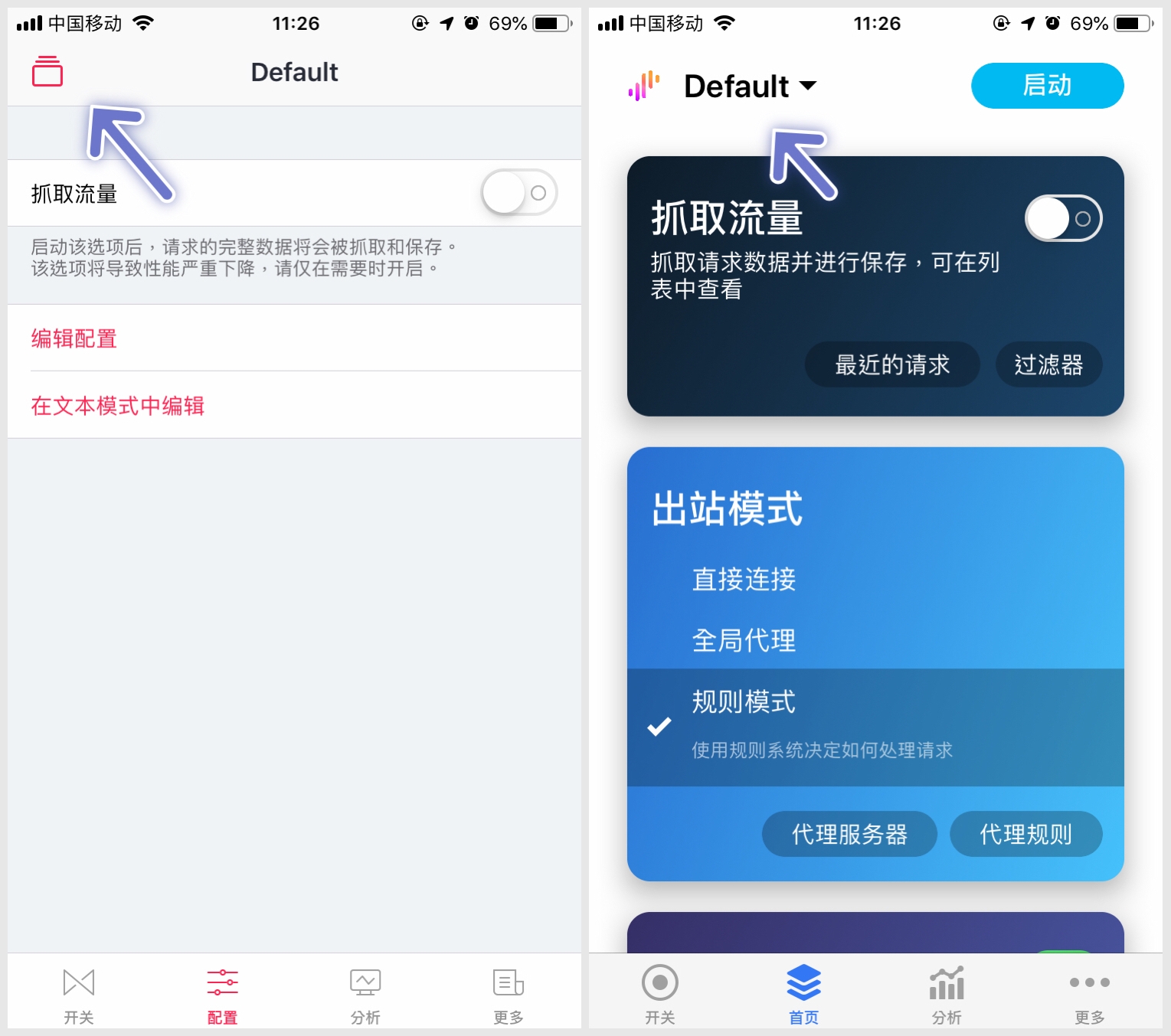 打开 Surge 3 点击左上角的「Default」进入配置管理页面。