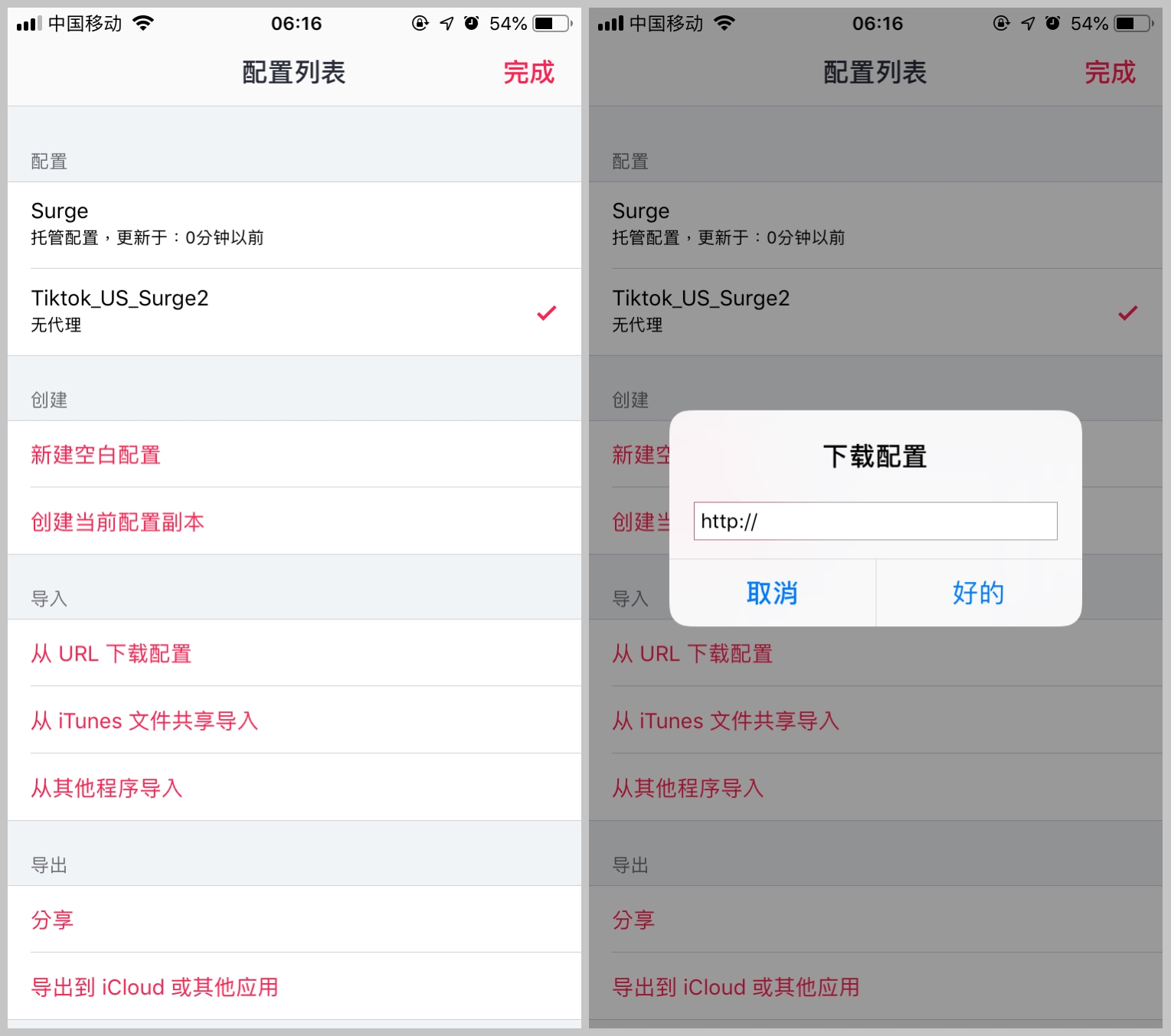 点击下方的「从 URL 下载配置」,在弹出的输入框中粘贴上方 获取订阅 中您对应的 Surge 版本的订阅链接并点击 好的,此时 APP 会自动下载并切换到该配置。