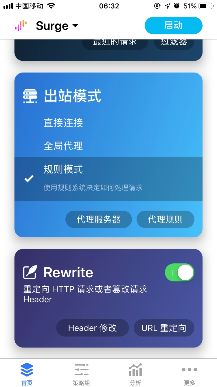 Surge 3 请 回到首页,选择「规则模式」并打开「Rewrite」的开关。