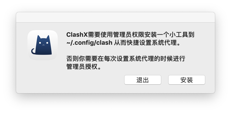 打开 ClashX,此时会提示您需要安装一个小工具,点击 安装 随后输入 macOS 账户密码即可。