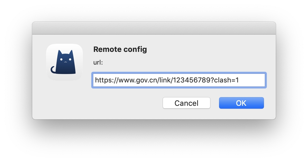 点击菜单栏中 ClashX 的图标,选择 配置 => 托管配置 => 设置地址,粘贴上方 获取订阅 中的订阅链接。