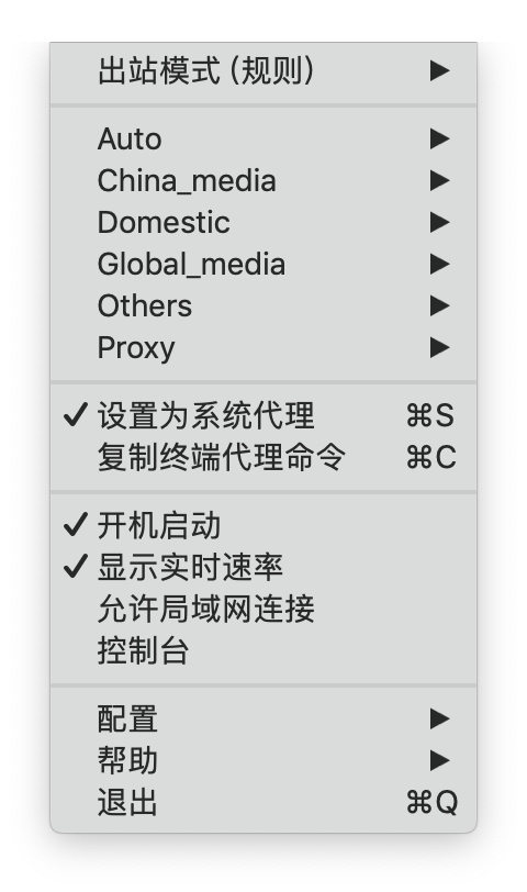 点击菜单栏中 ClashX 的图标,出站模式选择 规则,勾选下方的 设为系统代理 以及 开机启动。